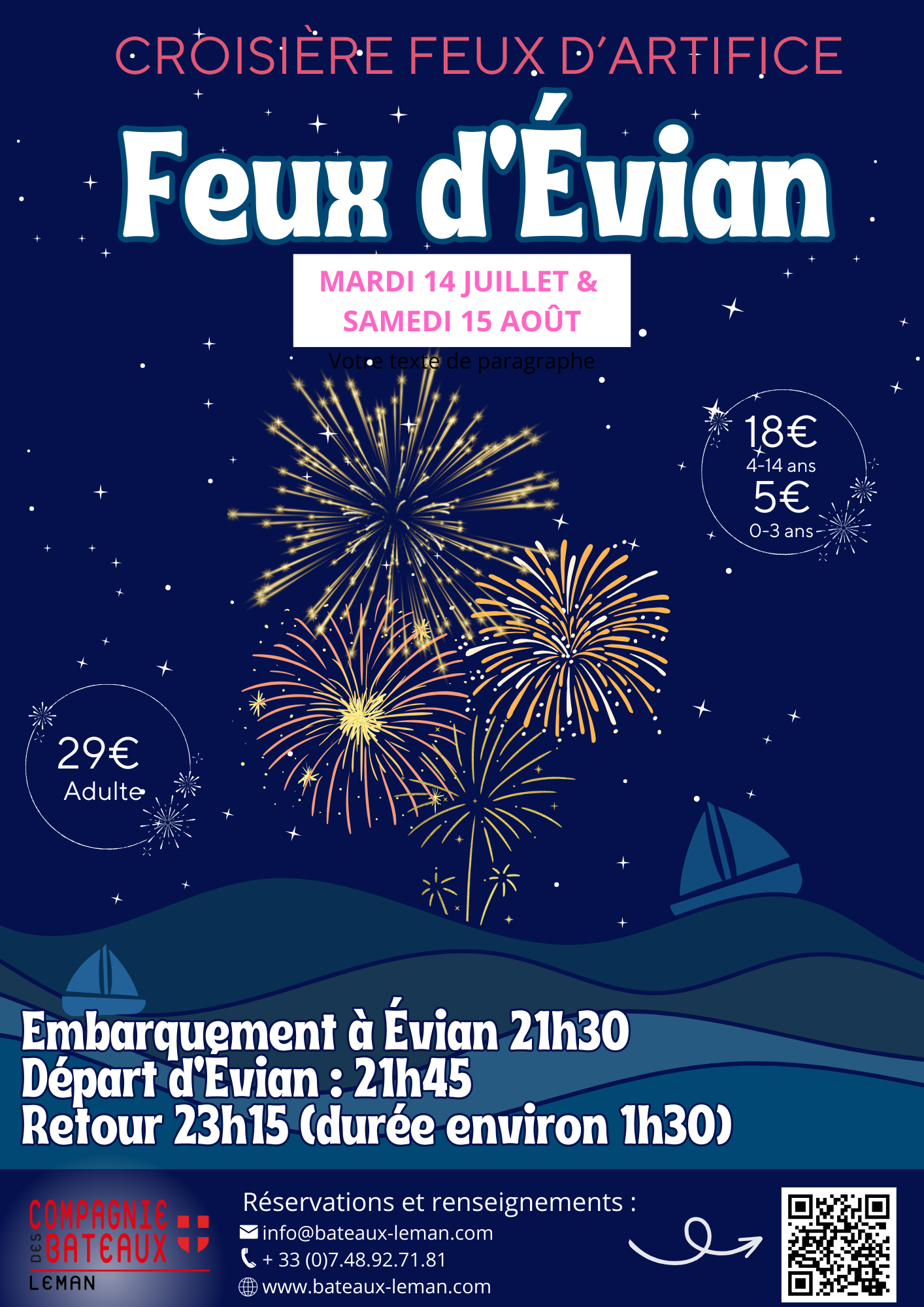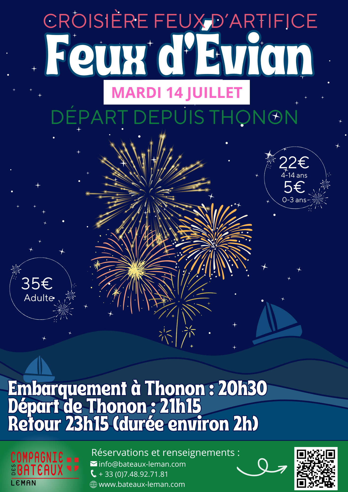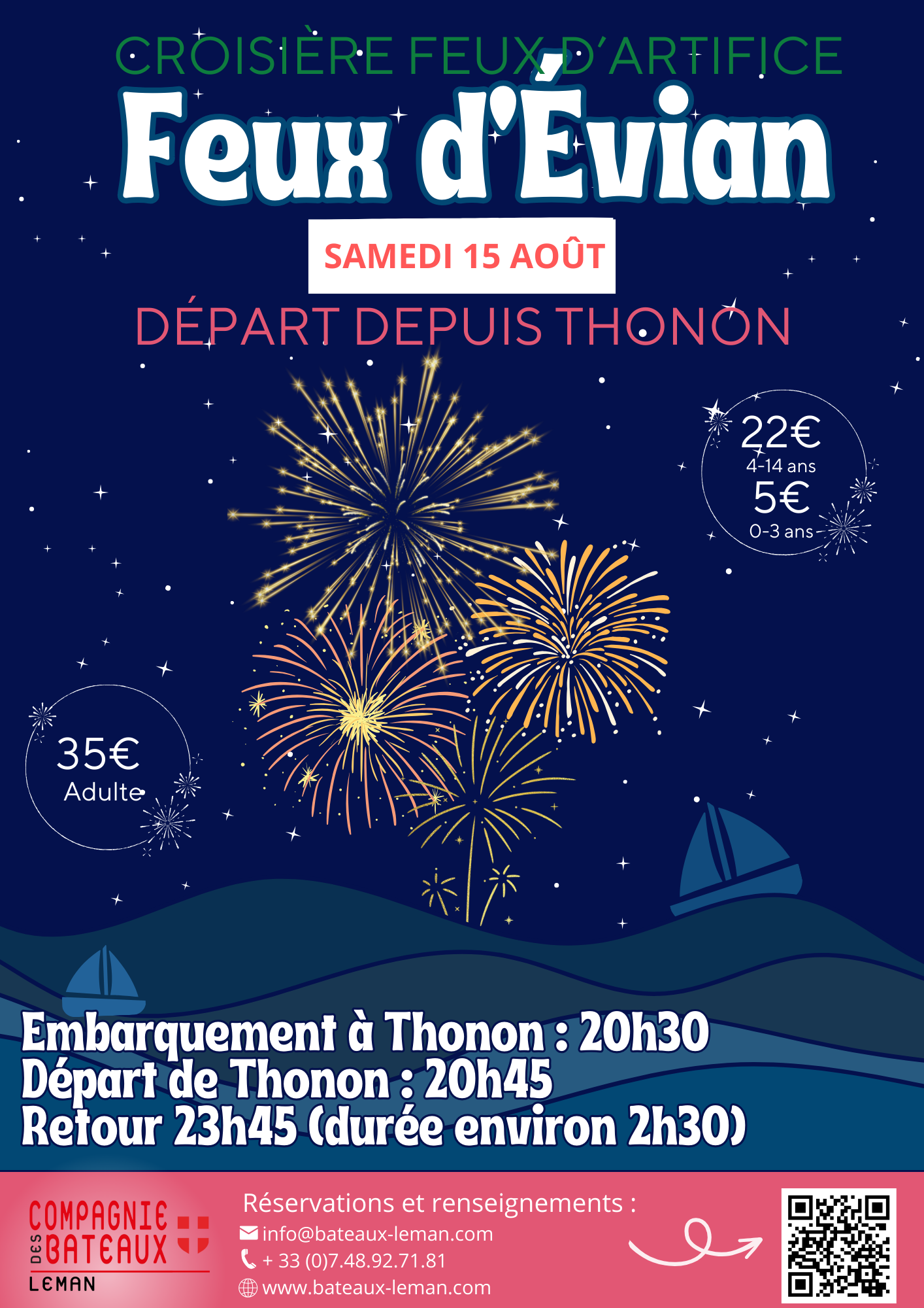 Le 14 juillet et le 15 aout, embarquez pour une croisière feux d’artifice sur le lac Léman, au départ du quais Baron Blonay découverte N°8 à Evian pour admirer les feux d’Évian. Profitez d’une vue imprenable depuis le bateau et échappez à la foule. Vivez une soirée magique et inoubliable. Réservez dès maintenant sur notre site web pour garantir votre place.