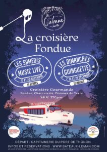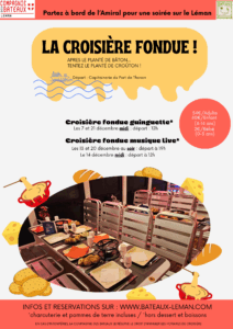Après le planté de bâton, laissez-vous tenter par le planté de croûton ! Embarquez pour une soirée unique alliant saveurs et détente sur le Léman, avec nos Croisières Fondue. Les samedis soir : 13 – 20 décembre 2025. Les dimanches midi : 7 – 14 – 21 décembre.